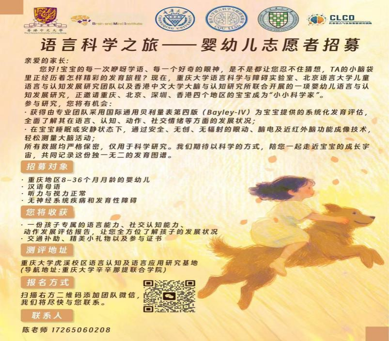 本次系列讲座为公众提供了高质量的科学育儿指导,展现了学术机构的社会担当。实验室表示将继续发挥学科优势,深化合作,为促进儿童语言与认知发展贡献力量。目前,实验室正在招募重庆地区的8-36个月月龄的婴幼儿家庭参与婴幼儿发展研究计划。欢迎符合条件的家长咨询报名。咨询电话:17265060208(微信同号);电子邮箱:[email protected]