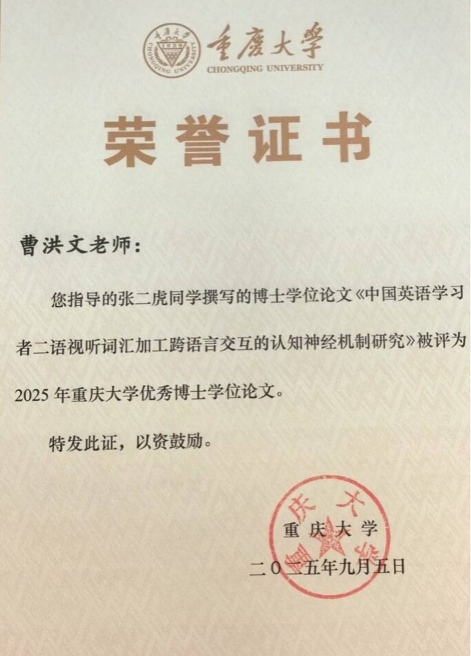 近日,学校公布了2025年漫蛙 优秀博士学位论文名单,我院2022届博士毕业生张二虎的博士学位论文《中国英语学习者二语视听词汇加工跨语言交互的认知神经机制研究》获评“漫蛙 优秀博士学位论文”,指导教师为曹洪文教授。
