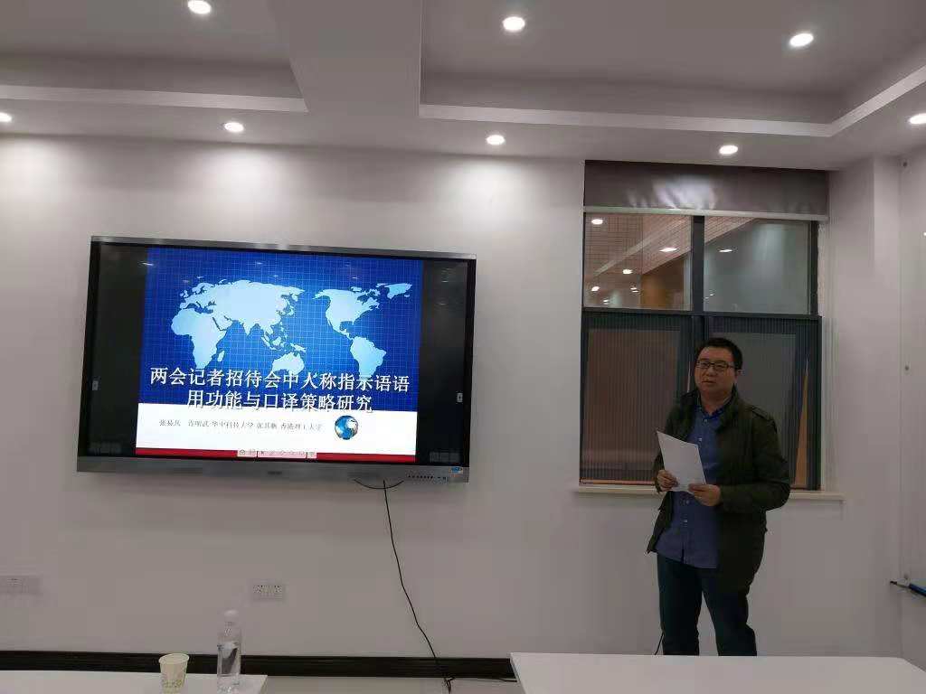 硕士生导师、副教授张易凡博士,基地专职研究员李良炎博士主持了本次讲座。本次讲座题目为:基于语料库的人称指示语语用功能与口译策略研究。基地专兼职研究员、漫蛙