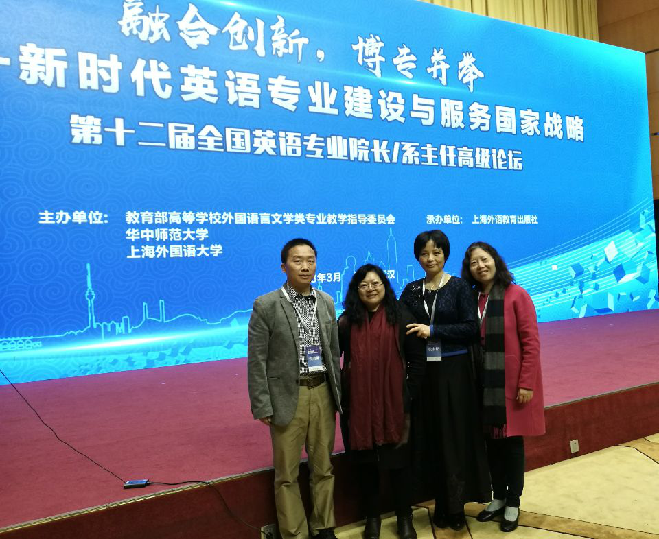 2018年3月22-24日,范定洪副院长与英语系主任毛凌滢教授,英语系李红教授,以及副系主任余泽梅副教授参加了在华中师范大学举行的第十二届全国英语专业院长/系主任高级论坛,会议以“融合创新,博专并举---新时代英语专业建设与服务国家战略”为主题,北京语言大学李宇明教授,上海外国语大学梅德明教授,复旦大学曲卫国教授等分别就如何培育国家的外语能力,英语专业的课程建设以及英语专业学生的思辨训练进行了内容丰富的大会发言,下午的分论坛以“英语专业人才培养中人文素质及学科素养的提升”、“英语专业人才培养中中西文化的通融”,“商务英语专业人才培养中语言与商务能力的融合”,“翻译专业人才培养如何助力中国与世界的融合”为主题,对相关领域的教学和人才培养进行了深入的探讨。本次会议内容丰富,信息量大,我院领导和三位教授与到会专家进行了较为深入的交流,我院英语专业改革和建设已经取得了较大的成效,本次会议的交流对于深化我院英语专业课程体系的建设具有较大的意义。