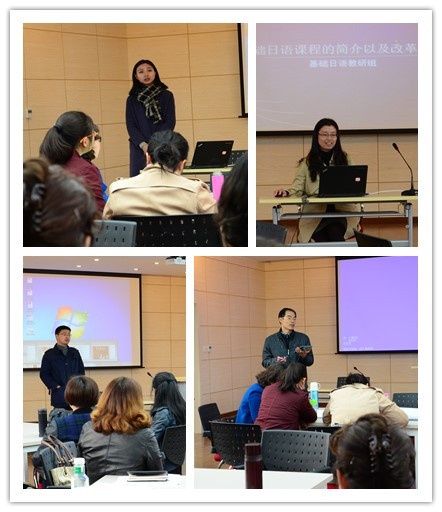 德语系郭萌老师以《基础德语》课程为例,讲解了如何在低年级训练零起点德语学生的语言基本功。日语系周璞老师代表《基础日语》课程组介绍了一年级语言基本功训练和二年级的教学改革实践。英语系的刘志刚老师和汪兴富老师介绍了在《英语时文阅读》课程中选材和教学设计等方面的思考和实践。