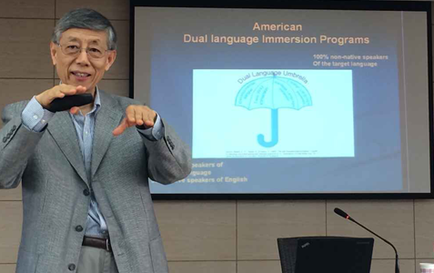 唐力行教授首先介绍了美国的汉语学习情况以及面临的来自社区、经济、师资等方面的挑战,回顾了源于加拿大法语沉浸式课程教学的类型和历史并重点详细介绍了美国双语沉浸式课程中的两种教学模式:全部目地语教学和50%目的语与 50%英语教学的具体教学过程。同时,唐教授指出,沉浸式课堂的教学目的并不是只提高外语能力,而是学生的母语和外语能力同时发展。唐教授在讲座现场还播放了华盛顿育英特许公立学校的沉浸式课堂实践录像及学校中文课的教室布置,直观、形象、生动地展示了沉浸式课程的实际教学过程。