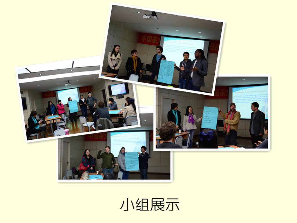 研讨最后的重点转移到了中外教师的实际课堂教学。每个小组讨论之后罗列出在教学活动组织过程中遇见的问题与解决方法,各小组陈述自己观点和看法,其他小组教师则可自由提问。虽然问题很多,但大家分享经验,共同出谋划策尽可能地多渠道解决课堂教学中遇到的种种困难,每个小组陈述之后都会引发新一轮更深层次的思考和讨论。