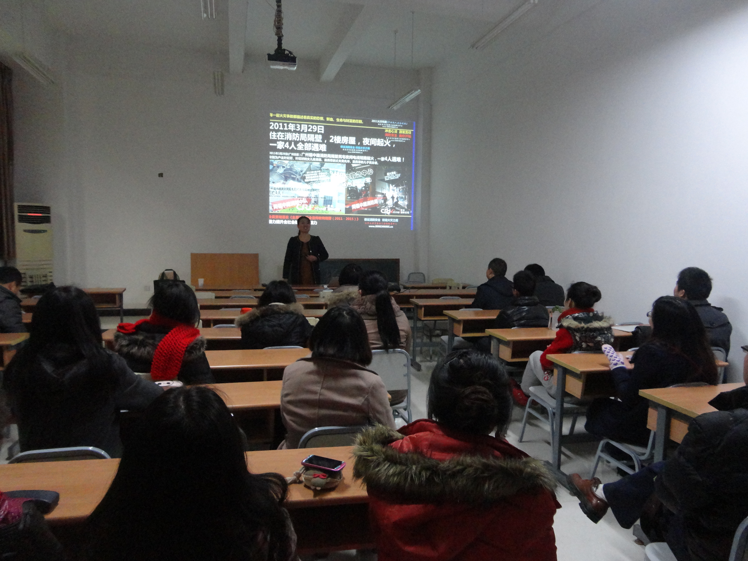 为进一步提高全院师生的消防安全知识及灭火技能,贯彻“预防为主、防消结合”的消防工作方针,普及全民参与消防的意识,2012年12月28日下午三点,学院特邀重庆市防火中心老师在虎溪校区学院楼105会议室为全院师生做了一次消防安全培训会。