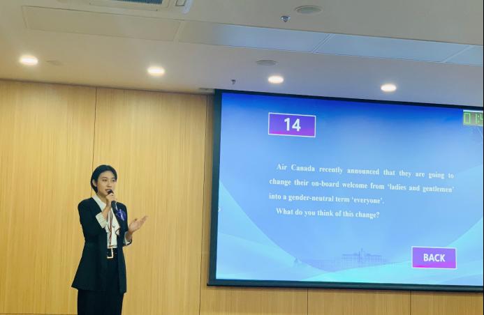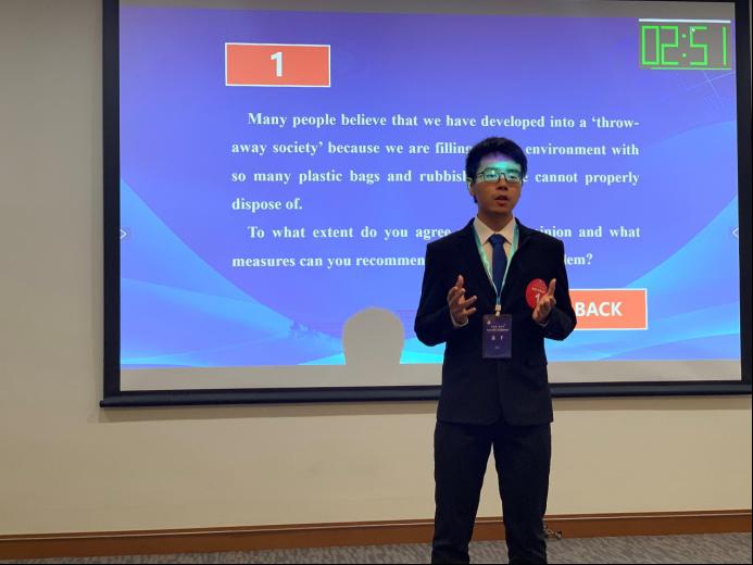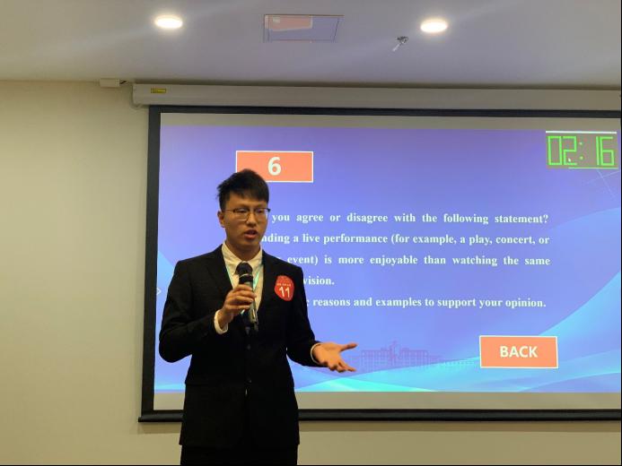 下午的决赛中,非英语专业组及英语专业组同学在同一赛场一决高下。选手们需要先进行3分钟即兴演讲,并回答两位外教各提的一问。针对严格的超时少时扣分1分的时间规则,以及外教灵活多变的提问,我校三位选手在演讲台上均能从容应对、机制化解,为最终取得优异成绩奠定了基础。