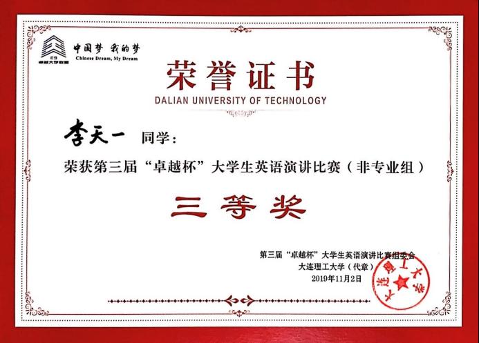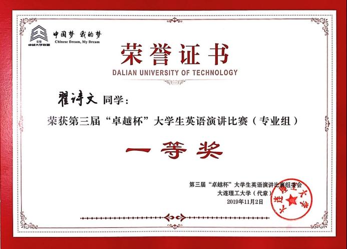 2019级黄梦遥同学和2018级翟诗文同学在第三届“卓越杯”大学生英语演讲比赛中荣获一等奖,UC联合学院2017级符赞灏同学荣获二等奖,电气工程学院2019级李天一同学荣获三等奖。本次卓越大学联盟第三届“卓越杯”大学生英语演讲比赛复决赛在大连理工大学举办,我校英语专业组2人和非英语专业组2人参赛。