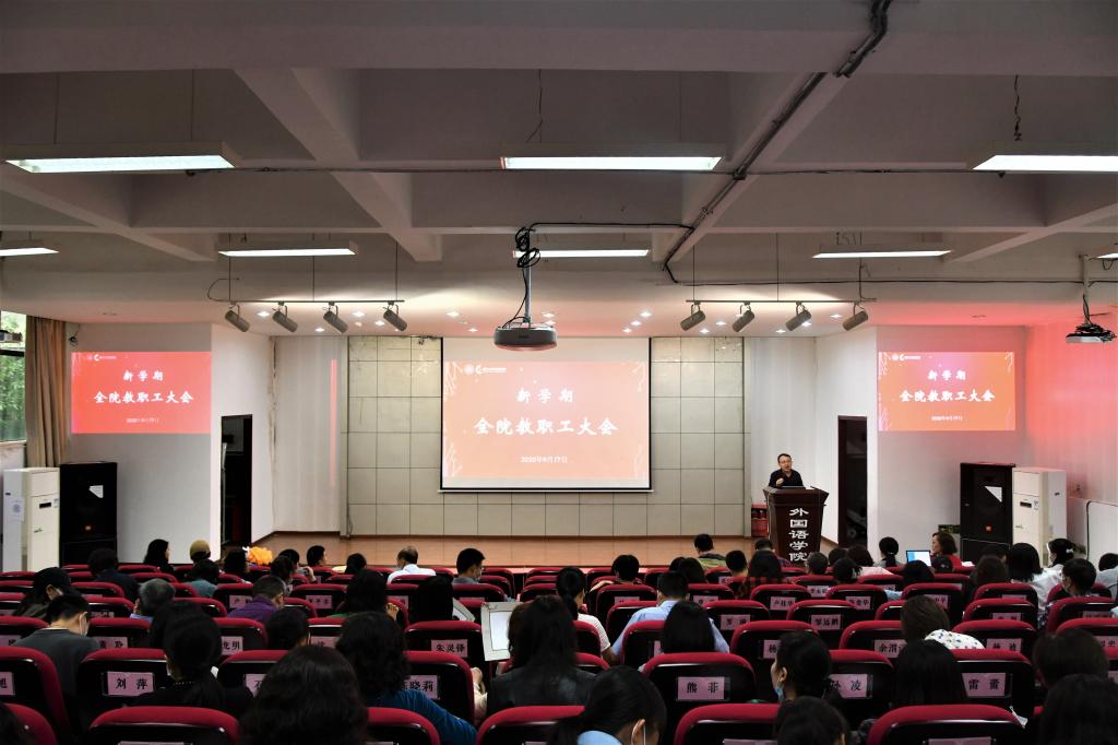 首先,彭静院长回顾了学院2019-2020年在党建工作、队伍建设、人才培养、科学研究、国际合作与交流等五个方面取得的可喜成绩,并对新学期工作要点做了部署。彭院长指出,在过去一年,各项工作整体呈良好发展势头,学院党建工作水平稳步提升,教师队伍建设从内核到外引均持续加强,专业教育与大学外语教育的人才培养成果丰硕,科学研究成效显著,国际合作与交流纵深发展。同时也分析指出学院发展存在的个中不足,提出本学期工作要点要围绕第五轮学科评估、完成“十四五”规划编制、启动一级学科博士点建设等三大方面进行。