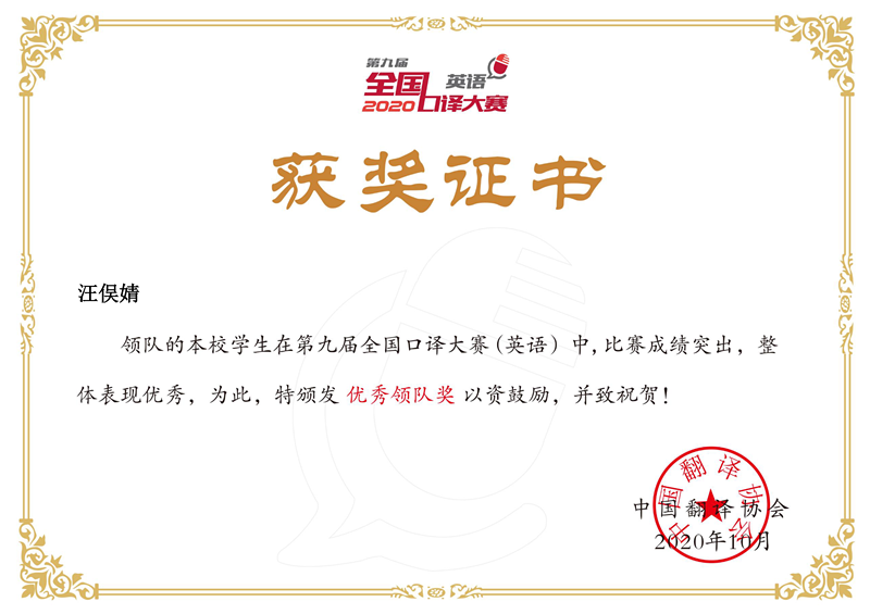 赢得了团体荣誉。这是对我校参赛选手突出表现的认可,是对站在选手身后给予指导与帮助的老师们工作上的肯定,也是我校在英语口译赛事中正式迈出一大步的重要见证,更能直接地鼓励我校广大学生参与到英语口译竞赛中来。