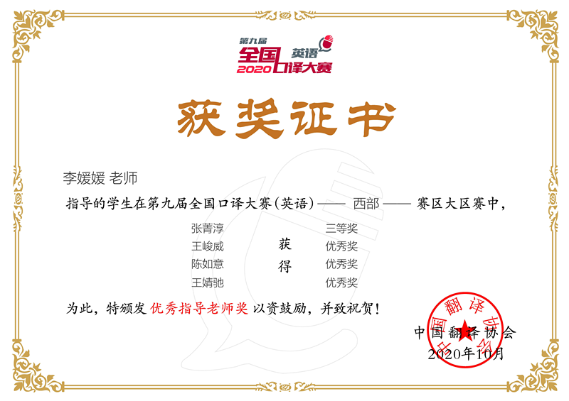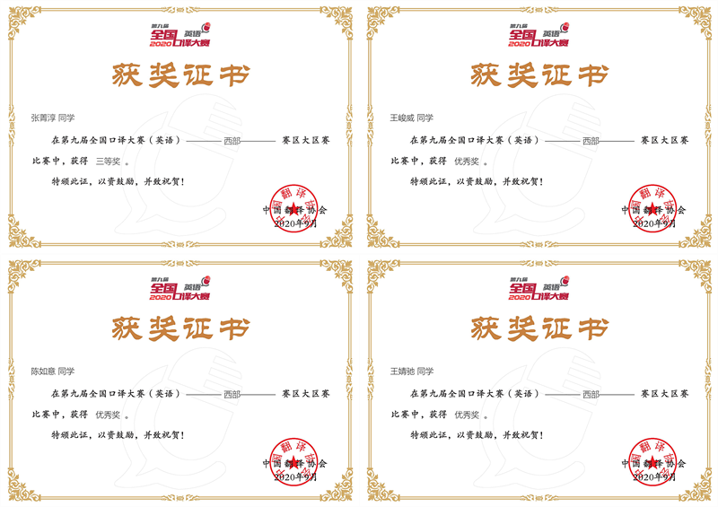 第九届全国口译大赛(英语)从初赛至大区赛三个阶段,遵循国家疫情防控大方针要求,全程实行线上选拔与参赛,历时4个月,我校累计评获奖31项。在校初赛阶段,我校从报名的100多人中筛选出57人参加比赛,评选出14名获奖选手,并从中推选出11名学生参加省市级复赛;在复赛中,荣获一等奖的2位选手和荣获二等奖的3位选手又凭借突出表现晋级至大区赛。在整个竞赛过程中,选手们获得个人奖项的同时,也为漫蛙