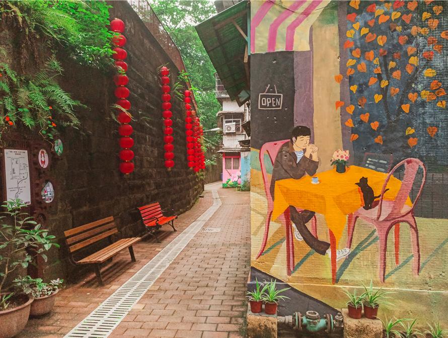 当同学们走进石井坡街道中心湾社区——花弄里,会发现自己进入了城中花园,一片干净、整洁、祥和的景象。居民们发扬特钢精神,自发的给巷子绘上颜色,利用废旧油桶、自行车、破旧轮胎等,通过涂鸦绘画等进行创意加工,将时尚青春的元素和充满岁月气息的建筑有机结合,还原特钢生活的美好回忆,让老旧社区重新焕发出生机。