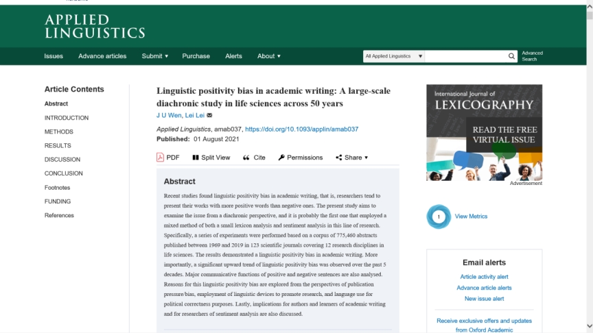 Wen, J., & Lei, L. (2021). Linguistic positivity bias in academic writing: A large-scale diachronic study in life sciences across 50 years.Applied Linguistics, amab037.//doi.org/10.1093/applin/amab037