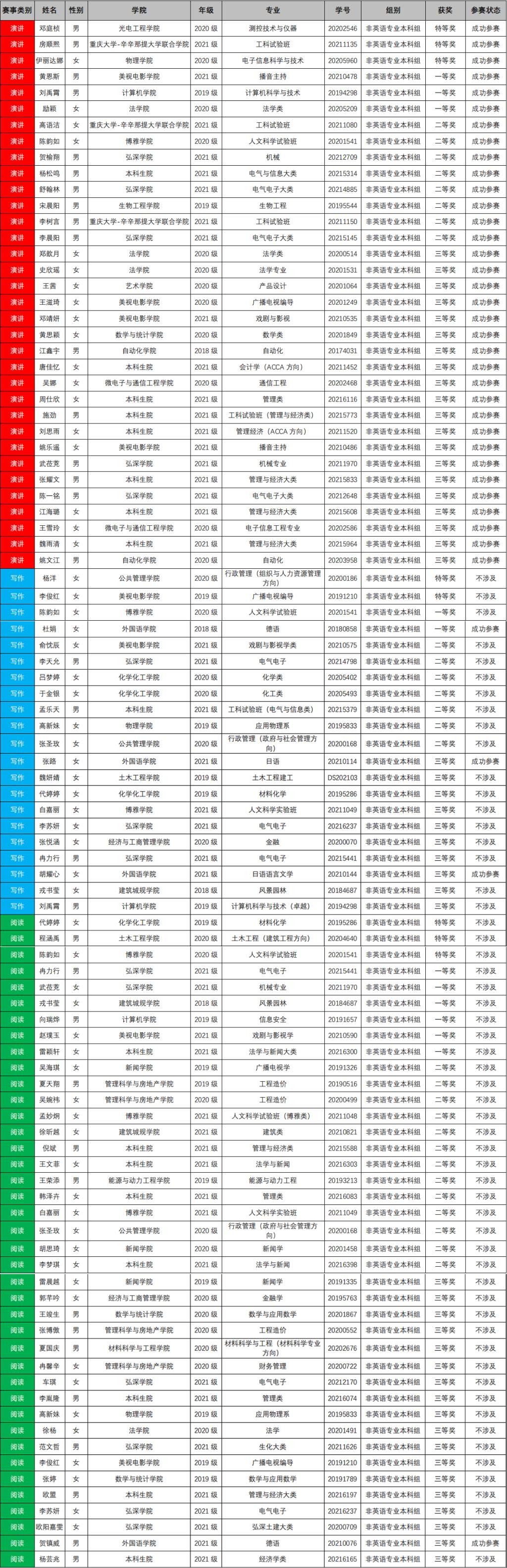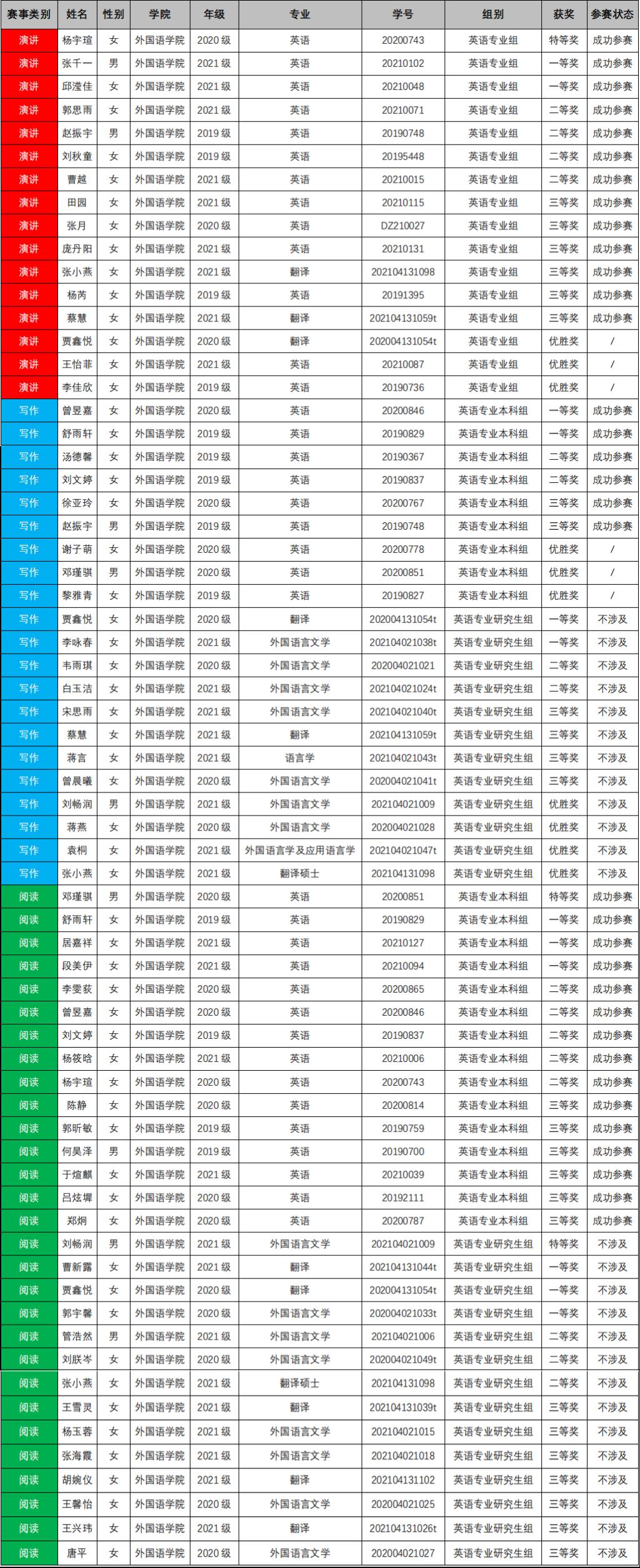 赛事选拔历时一个月,最终评定出233名获奖选手。其中,英语专业组获奖选手共66人,本科生获奖37人,研究生获奖29人;非英语专业组获奖选手共167人,本科生获奖95人,研究生获奖72人。具体获奖人数详情如下表: