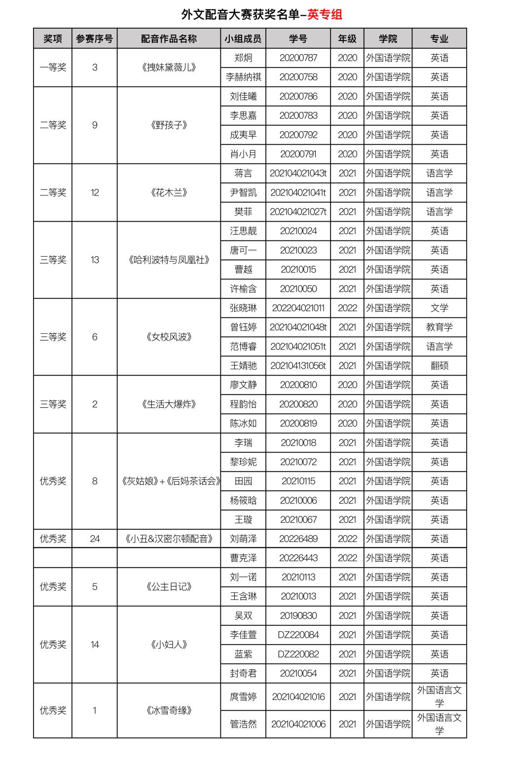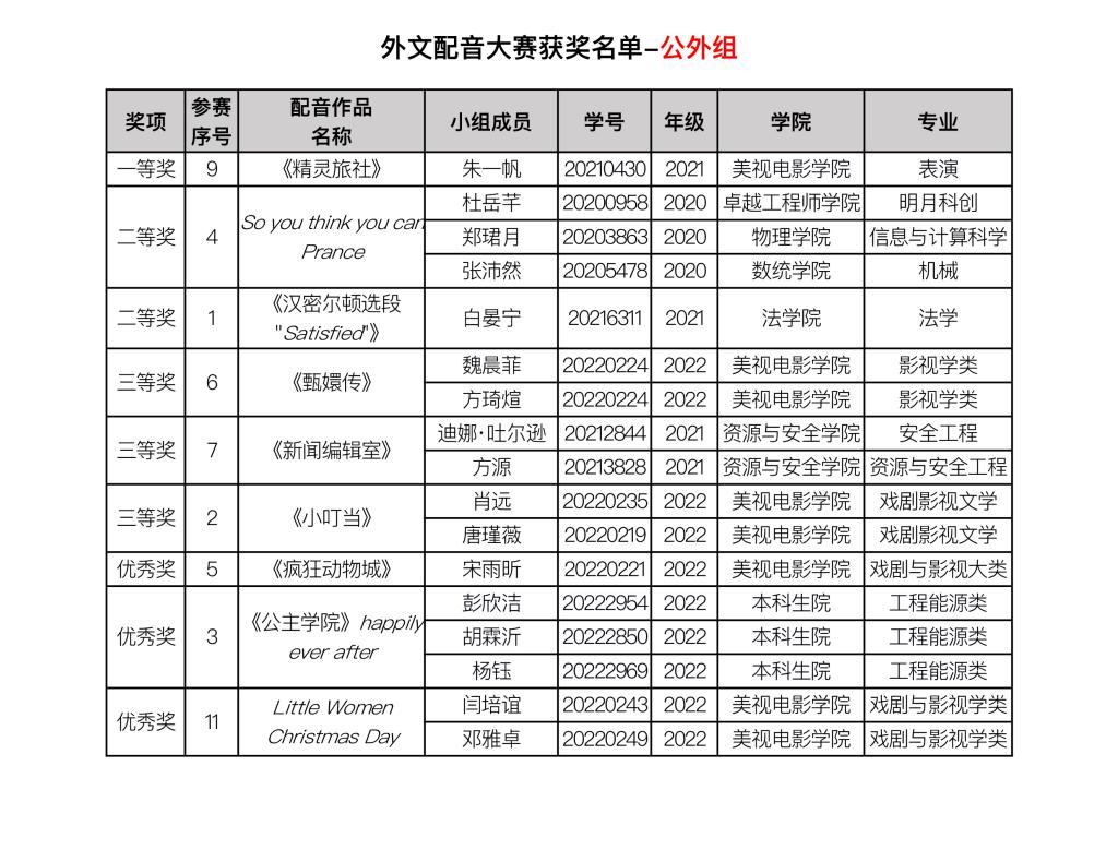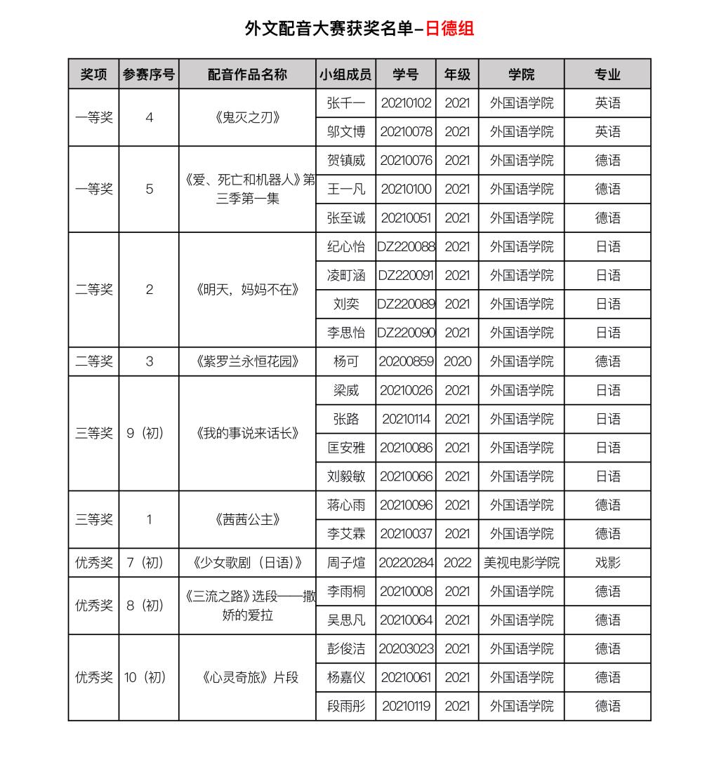 由漫蛙 主办、漫蛙 承办的漫蛙 第二十二届外语文化节系列活动之外文配音大赛已经结束。赛事自11月9日启动以来,吸引到全校近15个学院、29个专业的60支队伍前来参与,评选出29个获奖组74名获奖选手。其中,英语专业组共11个获奖组35名获奖选手,公共外语组共9个获奖组17名获奖选手,日语德语组共9个获奖组22名获奖选手。 现将外文配音大赛获奖名单进行公布。