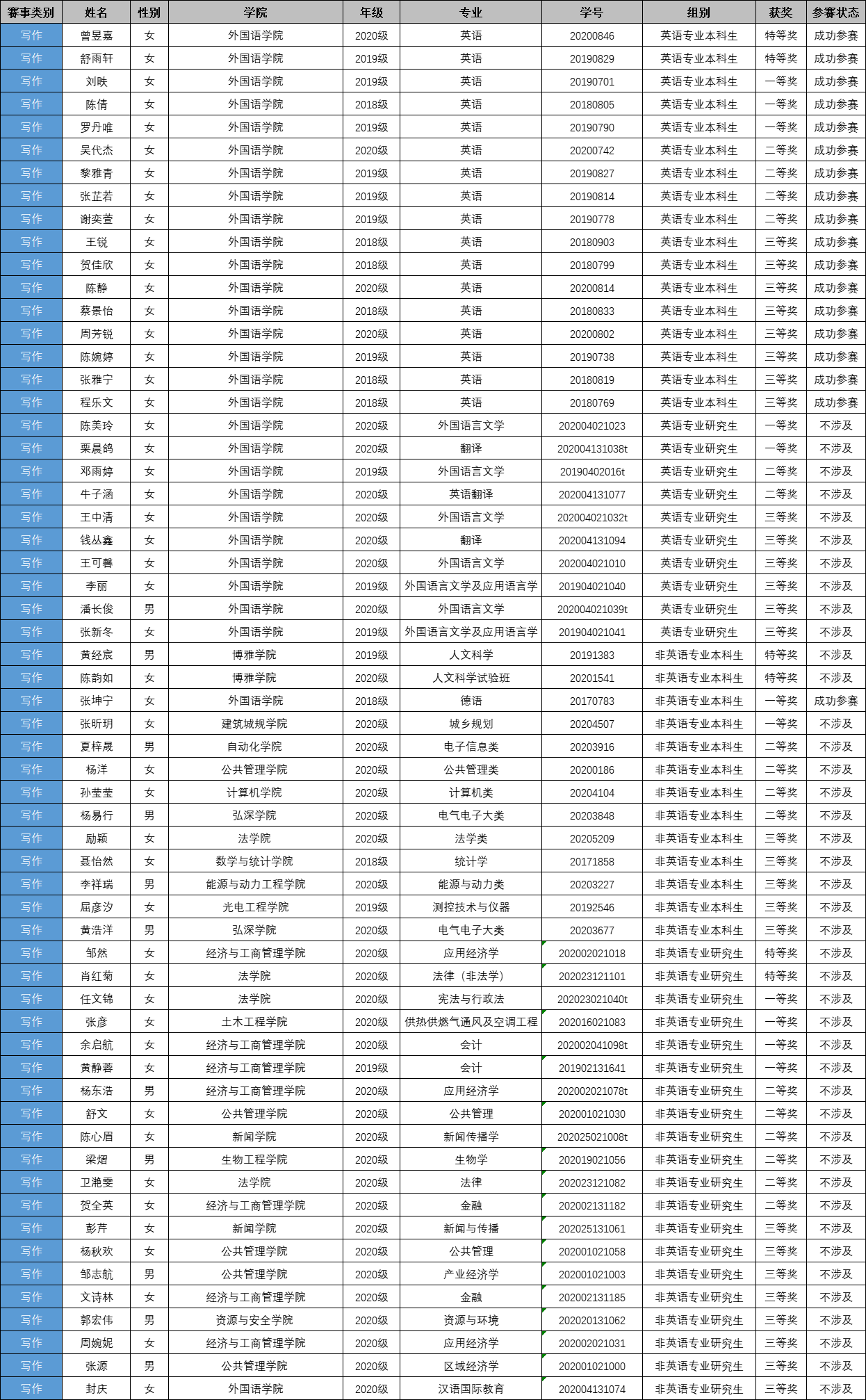 赛事选拔历时一个月,最终评定出253名获奖选手。其中,英语专业组获奖选手共87人,本科生获奖54人,研究生获奖33人;非英语专业组获奖选手共166人,本科生获奖79人,研究生获奖87人。具体获奖人数详情如下表: