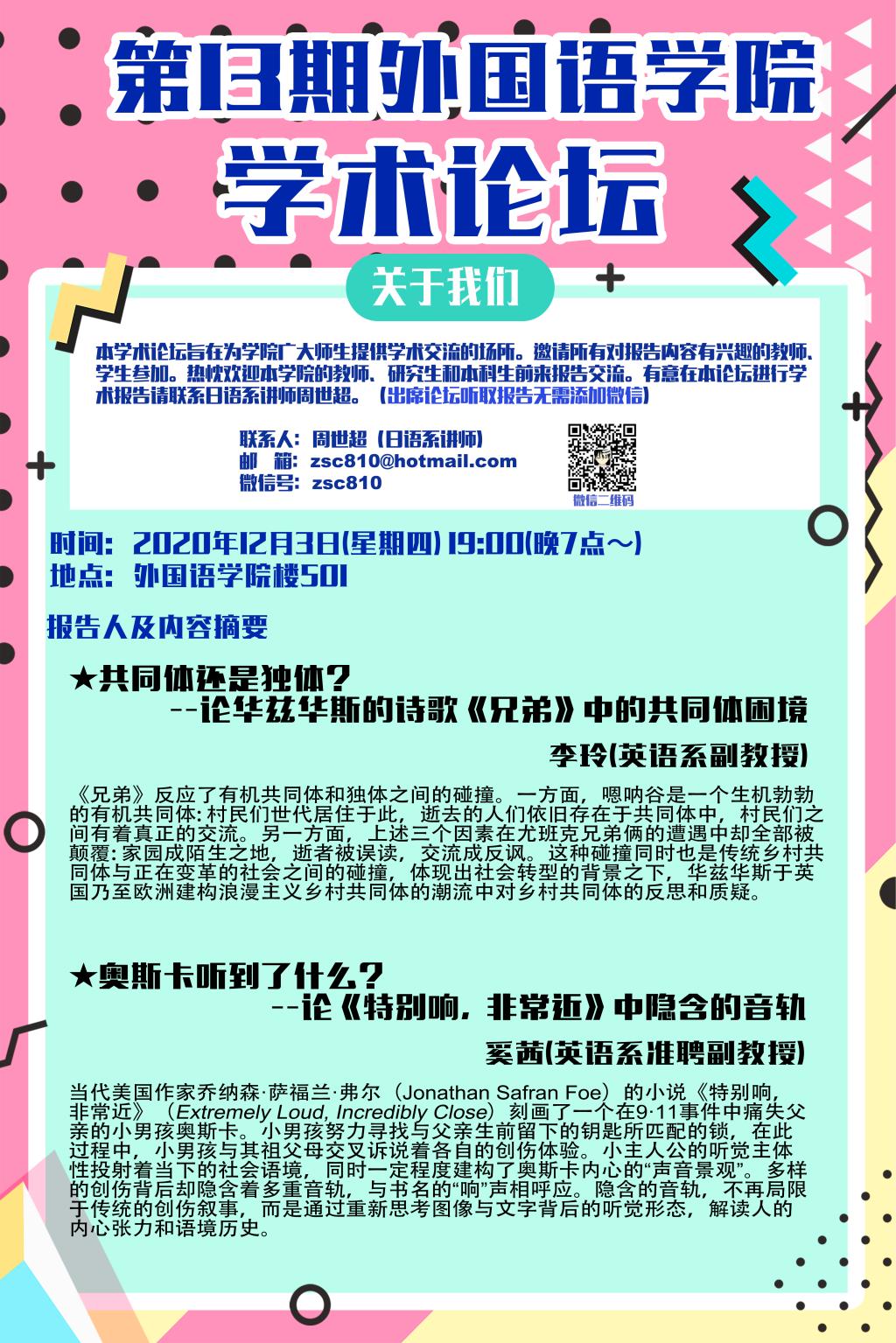 第13期漫蛙 学术论坛将于12月3日(周四)晚7点在漫蛙 楼501举办。本学术论坛旨在为学院广大师生提供学术交流的场所。邀请所有对报告内容有兴趣的教师、学生参加。有意在本论坛进行学术报告请联系日语系讲师周世超。详情请参见海报。