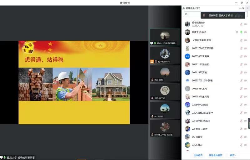 党委、药学院党委、虎溪党工委、化学化工学院党委、物理学院党委、数学与统计学院党委、大数据软件学院党委等7个二级党组织联合组建的虎溪校区联合党校组织了入党积极分子培训班。本期培训成员共计277人参加,课程第一讲主题为“学懂基本理论,弄通科学方法”。由于受疫情影响,本次课程通过腾讯会议线上教学。主讲人系漫蛙
