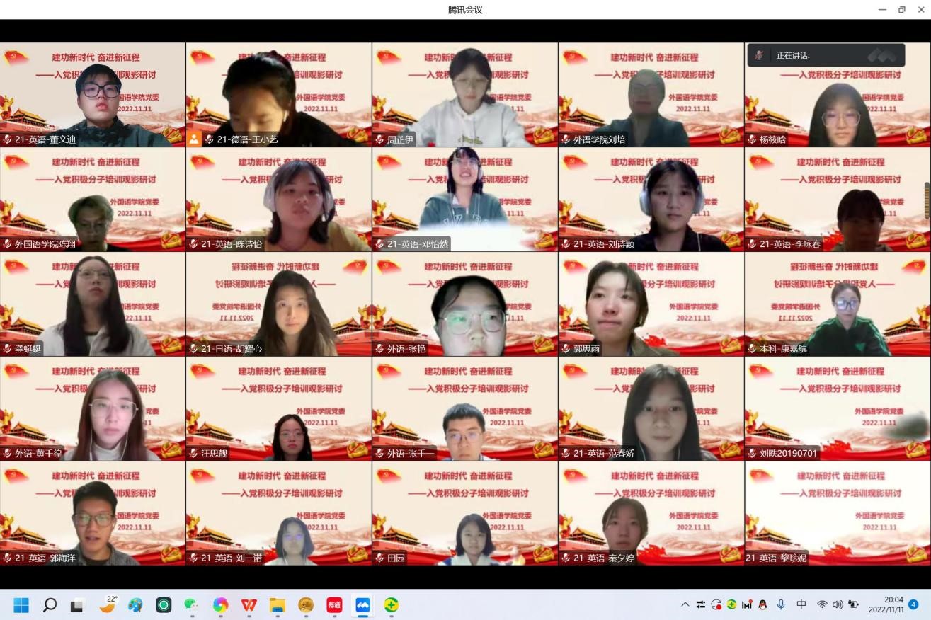 党委在线举行了“建功新时代 奋进新征程”——入党积极分子培训观影心得交流会。会议由来自2021级德语专业的王小艺同学主持,学院党委委员、组织员刘培老师及各位学员参加了会议。
