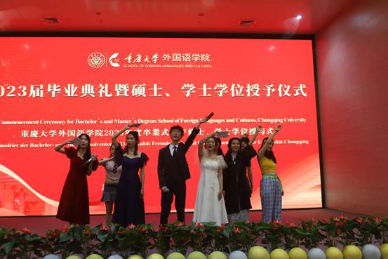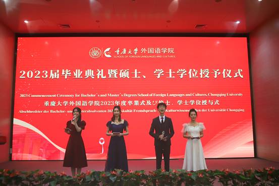 教师代表毛凌滢老师上台发言,带领同学们回顾了在重大的美好生活与三年疫情下学业的不易,对全体毕业生的顺利毕业表示祝贺。此外,她也给毕业生提了几条建议。一是要终身学习,不要躺平。二是要保持诚信、守住底线、保持真诚,人生是一个修炼自我的旅程。三是要担负起跨文化传播的使命,树立文化自信,拥有国际视野,促进文化交流。四是要弘扬校训,维护国家、民族利益。
