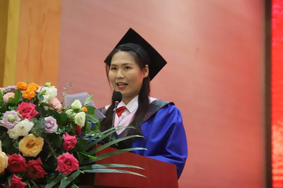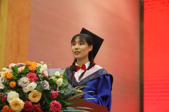 毕业研究生代表徐畅回忆了入学以来的点点滴滴,感叹岁月不居、时节如流。她感叹师恩难忘、师情永存,感谢领导老师的正确引导和悉心关怀。作为翻译硕士研究生,她深感自己的责任之重大,她提到,“复习民族,誓作前锋”将永远是她肩挑的责任。