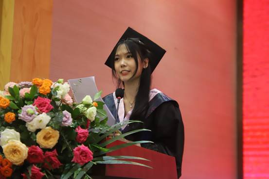 这四年的成长蜕变,她感慨大家曾受过的苦、流过的汗,更强调了坚持才最终成就了大家。在四年的学习生活中,她收获了学业的成功,也感受到工作上的成就感和肩膀上的责任。她鼓励各位毕业生,要不忘母校和学院的栽培,在自己擅长的领域中发光、发热。