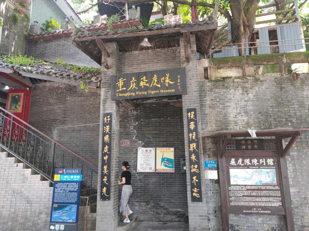 来到飞虎队博物馆门前,就可以看到“援华抗战永志不忘 好汉飞虎中美之光”这样一幅对联。爬上楼梯后可以看到门上贴着有飞虎队形象的年画。自从飞虎队来重庆后,日军的飞机不敢再轰炸重庆,重庆人民把飞虎队队员的形象作为年画贴在门上,以表达尊敬之情。