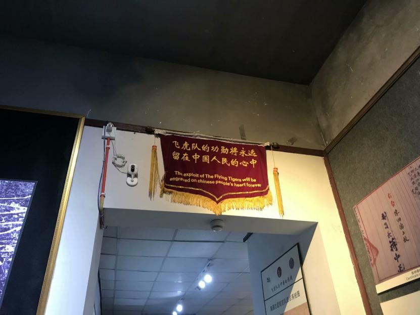 在准备离开博物馆的时候,实践团成员发现墙上还有一面锦旗。上面写着飞虎队的功勋将永远留在中国人民的心中。飞虎队在重庆、湖南怀化、昆明等地都有纪念馆。这些纪念馆以大量珍贵的图片、详实的史料和实物,全面梳理和展示"飞虎队"的传奇历程,重温波澜壮阔的抗战历程,回顾"飞虎队"的卓著功勋,铭记中美人民珍贵的传统友谊。