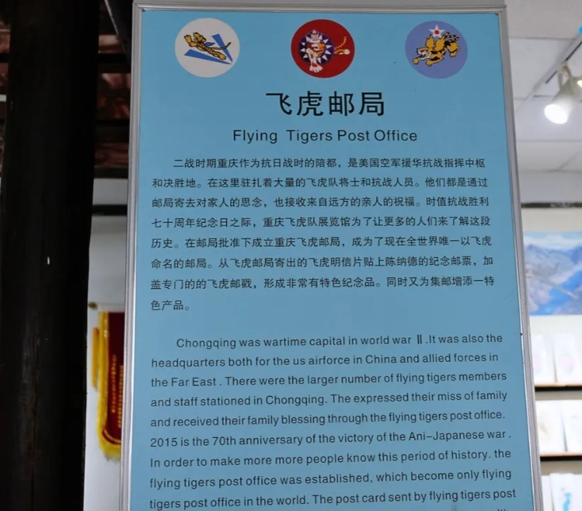 实践团成员还注意到在博物馆内部,开设了一家重庆飞虎邮局。重庆飞虎邮局经邮政管理部门批准成立,从这里寄出的邮品,将张贴飞虎将军陈纳德的纪念邮票,加盖专门的飞虎邮戳,形成弥足珍贵的纪念品。飞虎邮局成立当天寄出了首件飞虎明信片,收件人为陈纳德妻子陈香梅女士。2021年恰好是飞虎队成立80周年,博物馆也计划发行纪念邮票,举办纪念活动,其中包括邀请飞虎队老兵重访重庆。