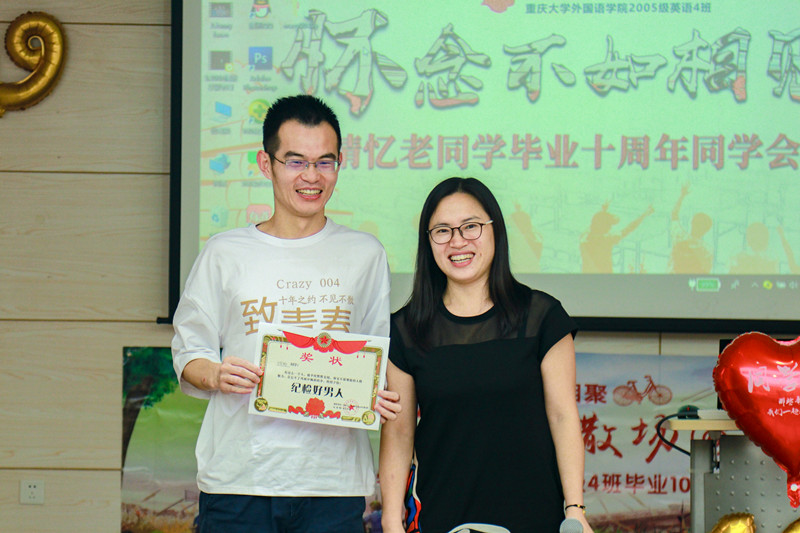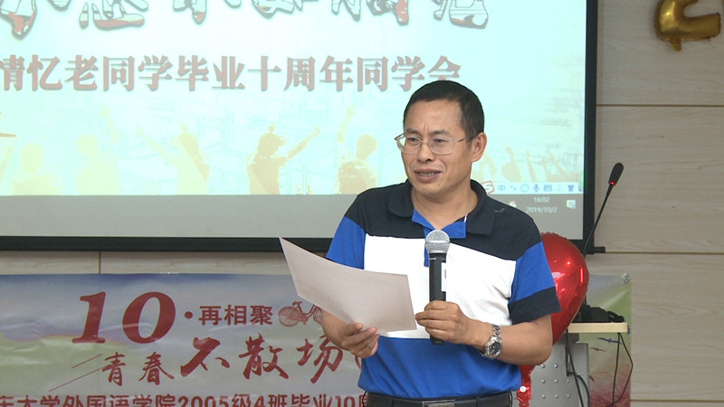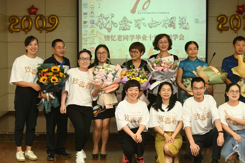 2005级英语四班的校友在学院楼501举办了毕业10周年同学会。学院书记欧玲、院长彭静、副院长李小辉以及雷蕾老师、温忠义老师、杨署东老师(原漫蛙
