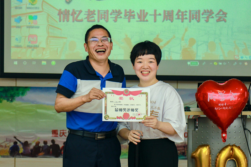 随后,便是一个别出心裁的“颁奖环节”。老师同学互颁奖状,通过赞词描绘记忆中的那个他。从“笑点最低奖”到“最帅老师奖”,从“最佳厨神”到“最佳博学多才老师”,千奇百怪的奖名之后缠绕的是同学与老师之间深厚的情义。
