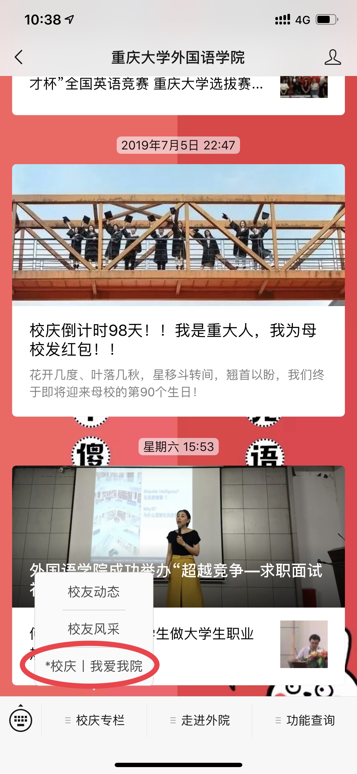 ”微信公众号。点“学院资讯”,选“*校庆丨我爱我院”,选择:我要支持,选择:漫蛙