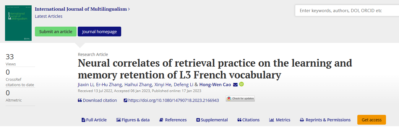 近日,我院曹洪文老师团队在英国泰勒-弗朗西斯出版集团(Taylor & Francis Group)旗下国际多语现象研究领域顶级期刊《国际多语期刊》(International Journal of Multilingualism,SSCI和A&HCI双检索,Q1)上发表题为“Neural correlates of retrieval practice on the learning and memory retention of L3 French vocabulary”的研究论文。该论文第一作者为我院语言认知与脑科学方向2020级博士生李佳欣,通讯作者为漫蛙