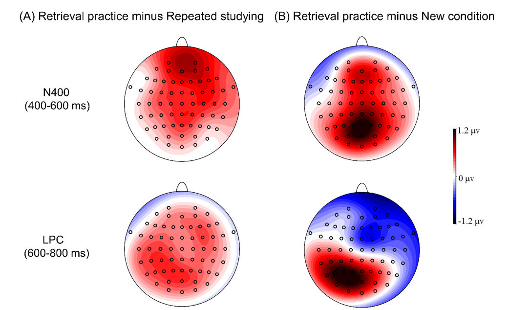 该论文采用高时间分辨率的事件相关电位技术从记忆的提取(在最终识别记忆测试阶段记录EEG信号)角度进一步探索了提取练习促进法语(L3)单词学习的神经机制。具体来说,本文比较了不平衡的中(L1)-英(L2)双语者在有反馈的提取练习和重复学习条件下学习法语(L3)单词的神经活动差异。行为结果发现了经典的提取练习效应,体现在提取练习比重复学习和新条件产生了更高的识别正确率和更快的反应时。这一发现表明提取练习比重复学习更能促进法语(L3)单词的学习和长时记忆保持。ERP结果发现,在中部和顶叶脑区,重复学习比提取练习诱发了更负的N400波幅;而在顶叶脑区,提取练习比重复学习引起了更正的LPC波幅。还有,在中部和顶叶脑区,新条件比提取练习引起了更负的N400波幅;在额叶和顶叶脑区,提取练习比新条件引起了更正的LPC波幅。综合上述结果表明,提取练习比重复学习和新条件在法语(L3)单词的学习中可能涉及更多的语义加工。实验结果如下图所示: