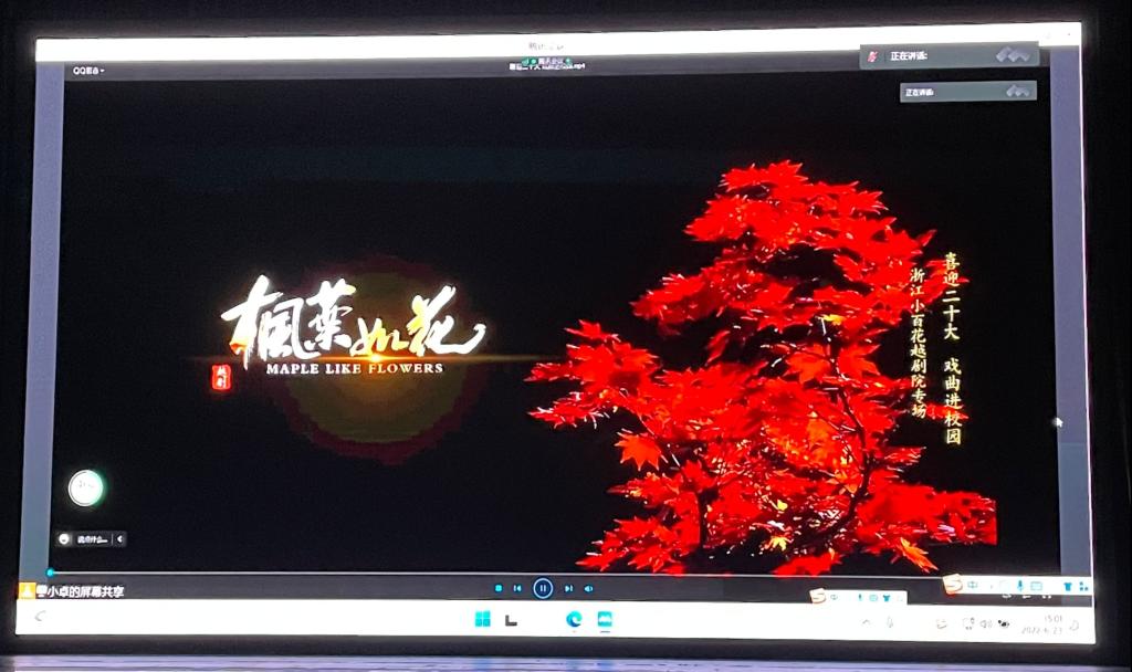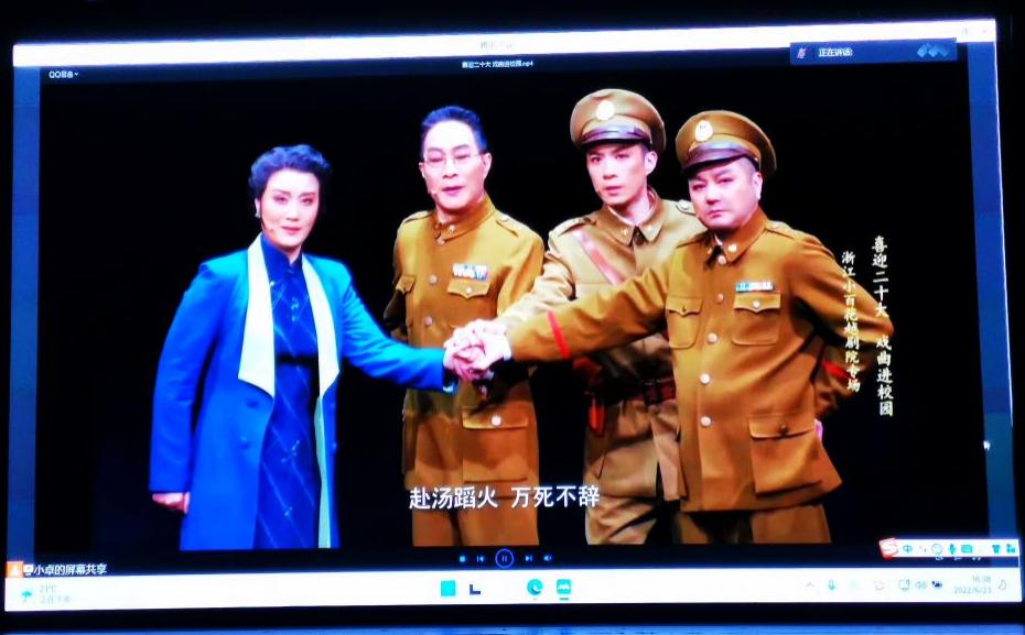 作为“不忘初心,牢记使命”主题教育专题学习内容之一,2022年6月23日下午,行政党支部成员赴虎溪校区学生活动中心小剧场集中观看浙江小百花越剧院越剧《枫叶如花》的云上直播。该剧是“喜迎二十大,戏曲进校园”爱国主义主题展演活动剧目之一,荣获浙江省第十四届精神文明建设“五个一工程”优秀作品奖、第十四届浙江省戏剧节兰花奖·特别大奖及2019年国家舞台艺术精品创作扶持工程入选剧目。