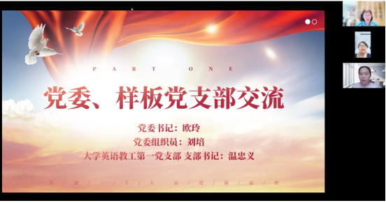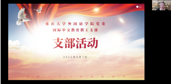 2022年9月8日下午,国际中文教育教工支部开展了线上组织生活。会议由国际中文教育教工支部书记龙藜主持,学院党委书记欧玲、党委组织员刘培、重庆市样板支部大学英语教工第一党支部支部书记温忠义和全系党员同志参加了会议。