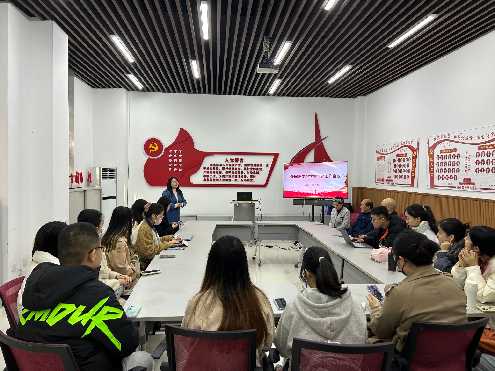 刘培老师主要介绍了发展党员、党内统计、支部书记述职以及党员民主评议等工作安排,通报了本学期预备党员接收及转正情况、第47期积极分子培训情况,要求各支部及时更新和维护数据信息,梳理本年度支部工作情况,为开展支部书记述职和党员民主评议做好准备。