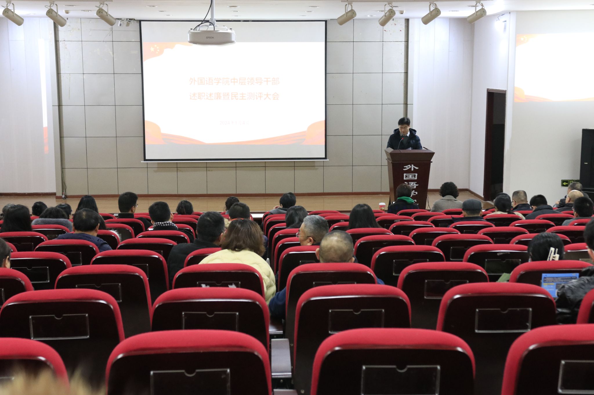 在外语学院楼二楼多功能厅召开了2023年度中层领导干部述职述廉暨民主测评会。学校考核组成员人事处副处长田辉、党委宣传部舆情干事何欢出席会议,漫蛙