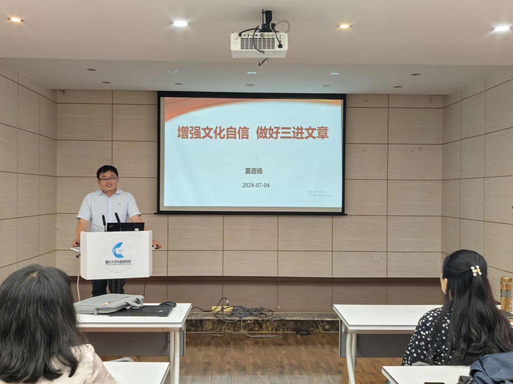 莫启扬院长以《增强文化自信,深化三进教育》为题做了报告。在报告中,莫院长追溯中华文明历史,强调其独特统一与包容性构建的文化自信,并指出文化自信对高等教育的核心意义,强调文化传承需融入价值观教育。针对学院专业教学中的“三进”工作,他提出将《理解当代中国》系列教材内容有机融入专业课程教学,让学生在掌握语言技能的同时,潜移默化地提升文化自信与塑造价值观,推动专业教学改革持续深化。