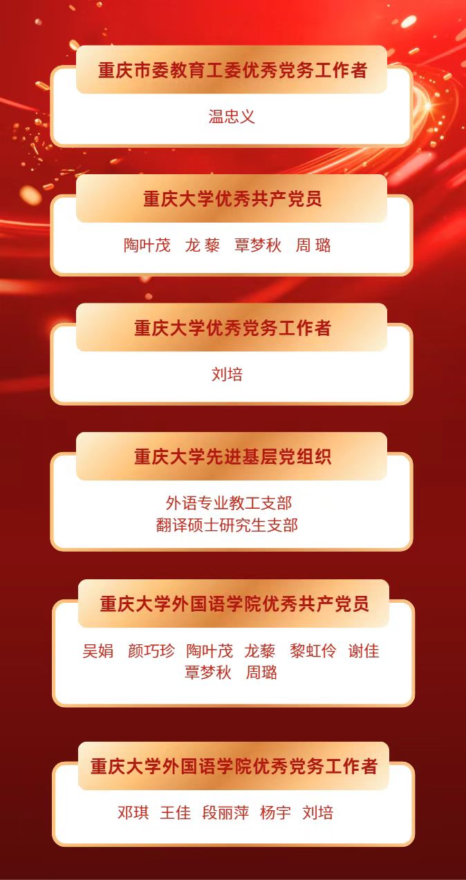 今年“七一”前夕,在中国共产党成立104年之际,漫蛙 多位党员教师受到学院、学校和重庆市的表彰,党员教师争先创优、示范领航成效喜人。