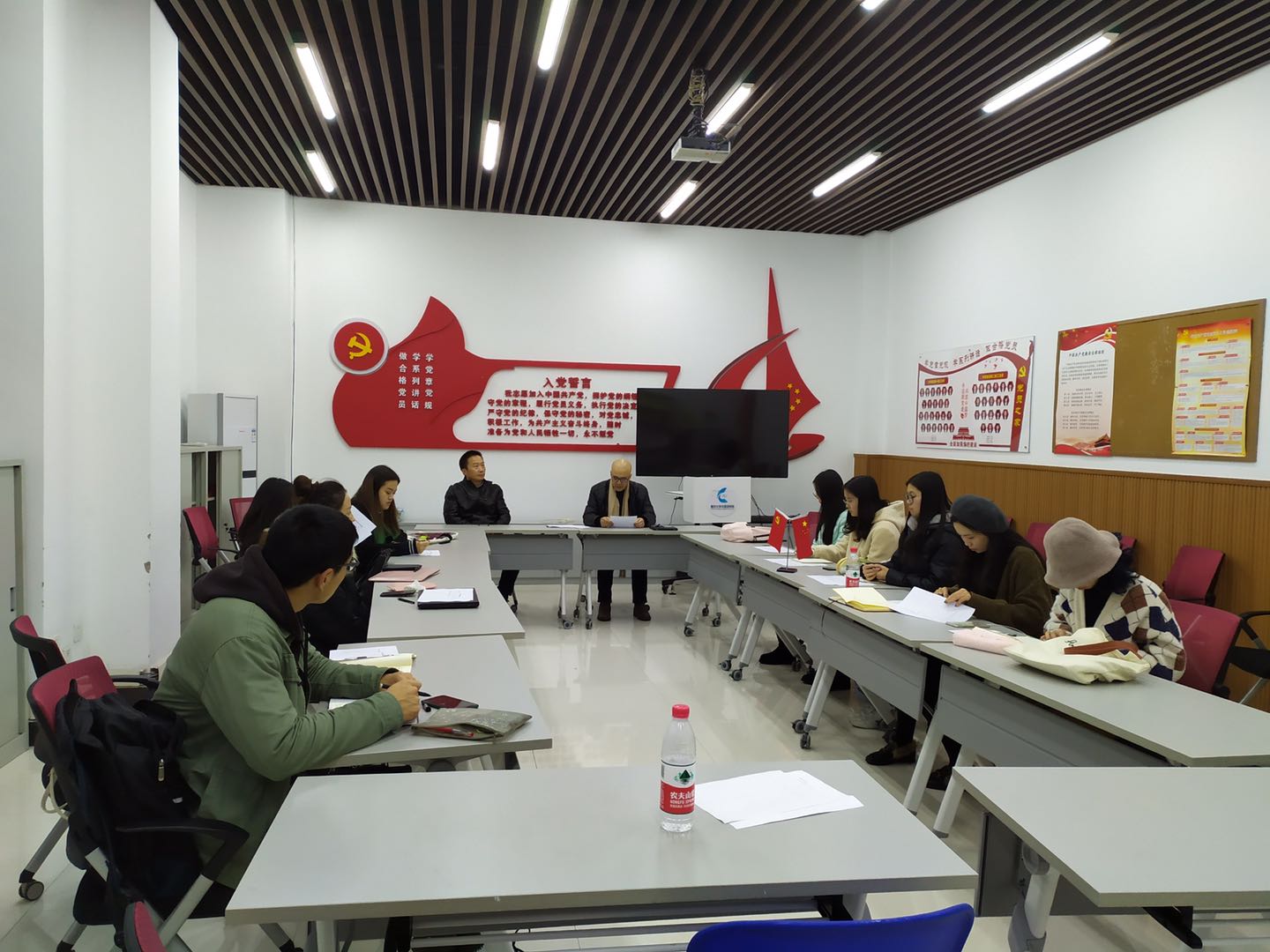 楼105举办支部书记讲党课、民主评议党员及专题组织生活会三项活动。院党委委员范定洪老师、支部书记游振声老师、翻译硕士党支部全体党员参与了此次会议,会议由党支部组织委员邱馨仪同志主持召开。