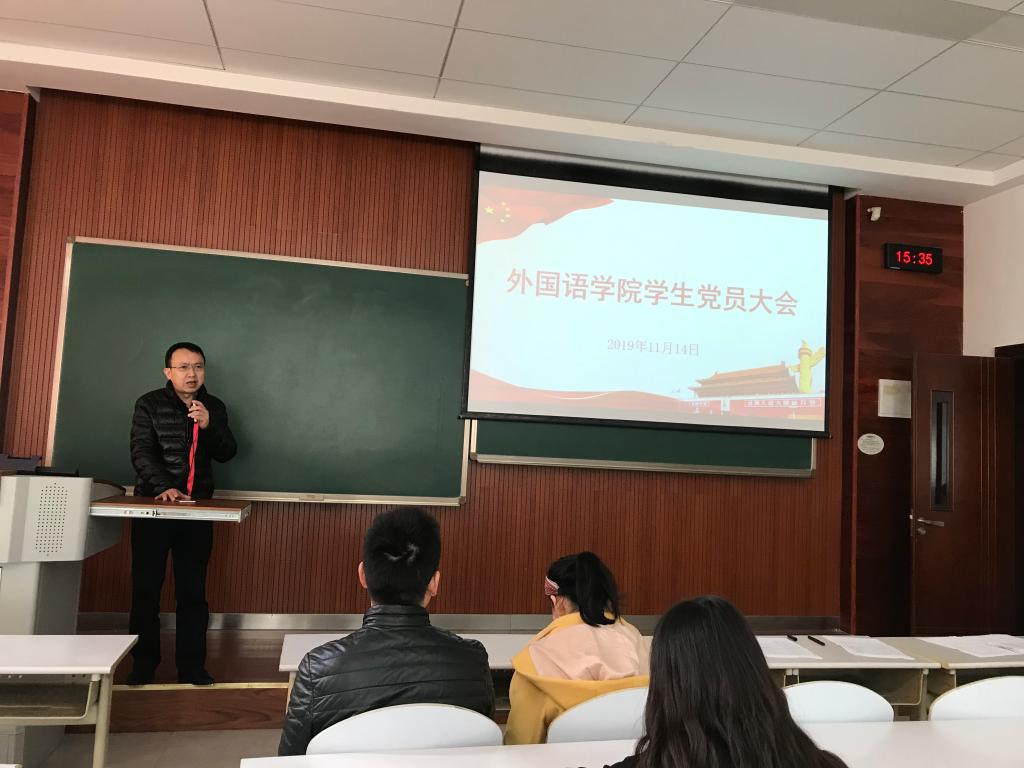 首先,魏书记强调了“不忘初心、牢记使命”主题教育的重要意义,并结合香港问题指出作为学生党员和新时代大学生坚定理想信念的重要性。魏书记谈到作为学生党员,要有党员的操守,要坚定政治立场,拨开云雾认清事件本质和真相,作为内地大学生,更要坚定自己的爱国主义信念。其次,魏书记还对学院党委、纪委换届选举事宜进行了说明和部署,强调换届选举是学院党内政治生活的一件大事,是党员学习教育和增强党员意识的重要形式,作为学院党组织的一份子,每个学生党员都要不断加强自身党性修养,以饱满的政治热情、对学院发展认真负责的态度,积极行使自己的选举权。同时,魏书记还就学院党委、纪委候选人以及换届选举大会流程向各位学生党员做了简要介绍。