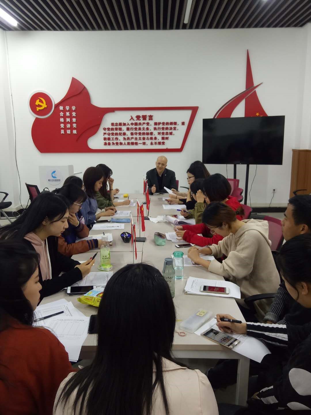 翻译硕士党支部于2018年3月15日19:00在学院楼105活动室开展民主评议党员,进行了批评与自我批评,还开展了学习“两会精神”活动。会议由支部副书记尤思婕主持,游振声老师、翻硕党支部全体正式党员、预备党员参加了此次会议。