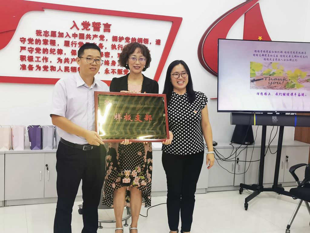 党委在105党员活动室举行了大学英语教工第一党支部获重庆市党建双创工作“样板支部”挂牌仪式。学校组织部副处级组织员魏群义同志,重庆市政协委员、沙坪坝区政协常委、农工重庆市委员、彭静院长,学院党委书记欧玲同志以及学院专职组织员、教工党支部书记代表、群众代表、学生党支部书记代表、大学英语教工第一支部和第二党支部的全体党员同志们出席参加了授牌仪式,仪式由学院副院长李小辉同志主持。