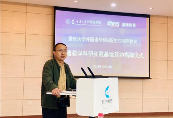 签约揭牌仪式后,重庆新东方国际教育运营总监姜波先生就重庆新东方国际教育业务板块及高校合作案例展开介绍。姜总监详述了新东方集团教育业务矩阵,讲解了新东方的高校人才培养与发展建设合作模式,并针对新东方实习相关事宜为现场学生进行介绍和答疑。