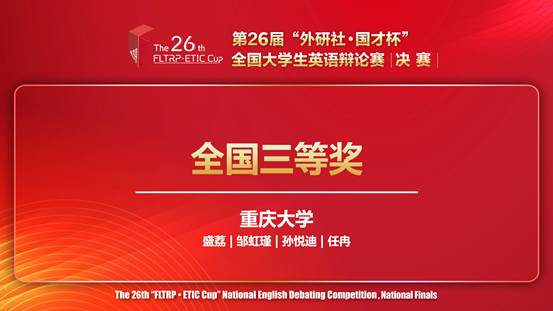 我校两位辩手经历了区赛的沉淀打磨,面对国赛中更具挑战的辩题谨审慎析,化繁为简、稳扎稳打,凭借扎实的辩论技巧和严谨的逻辑思维与对手进行交锋切磋、据理辩驳,展现出较强的英语语言综合运用能力和夯实的知识储备。二人经过层层较量,凭着默契的配合,最终以全国三等奖的成绩收官本届大赛。