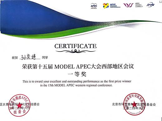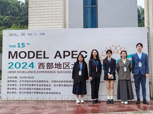 6月8日,2024年第十五届MODEL APEC西部地区大会成功举办,大会由北京市环亚青年交流发展基金会、亚太青年模拟APEC大会组委会主办,四川外国语大学国际关系学院承办,来自西部地区10余所高校优秀青年代表齐聚山城激烈角逐。我校1人荣获一等奖、3人荣获二等奖、1人荣获三等奖,孙奕婷以一等奖的成绩晋级第十五届MODEL APEC全国大会。