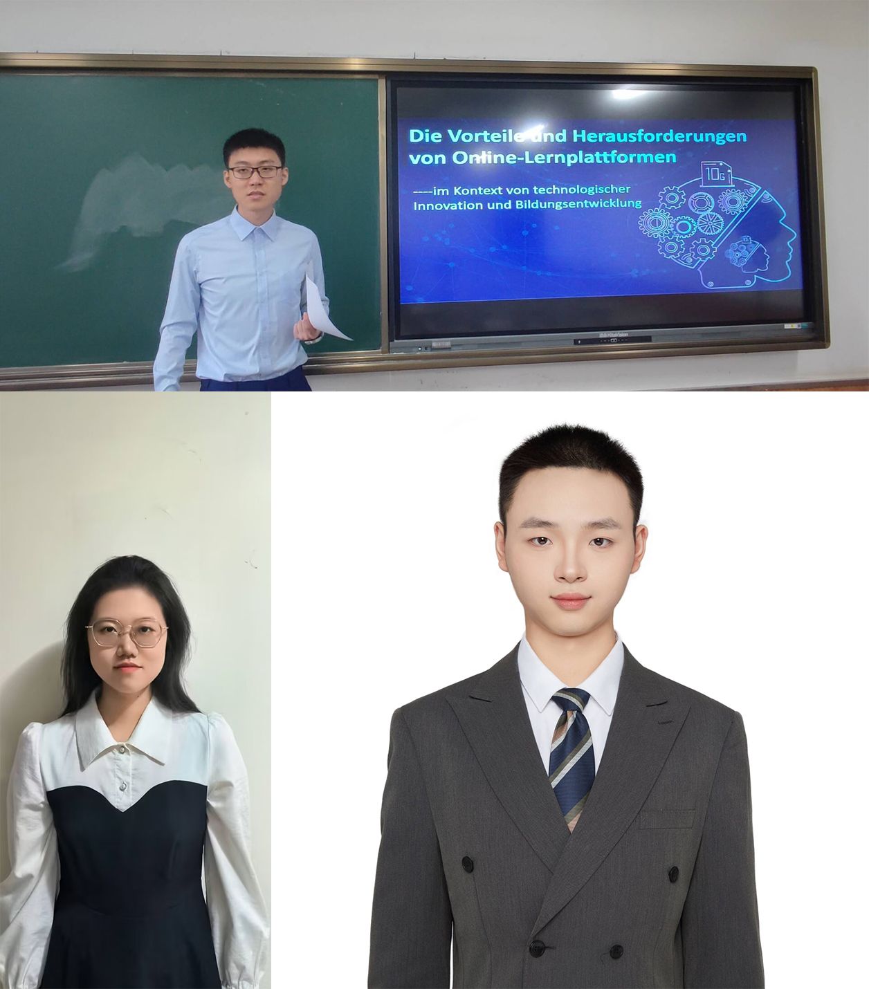 我校参赛团队成员2021级德语专业本科生王一凡,2022级德语专业本科生付雯蕾、蒋金宏根据《理解当代中国德语读写教程》第三课“China als Innovationsstandort”这一话题和十四五规划中关于科技创新和教育发展的相关政策,以Moocs平台为例,讲述了中国线上教育平台的优点以及面临的挑战,并提出一些解决网络教学平台问题的办法,最后展望中国在线教育光明未来。团队在指导教师向璐的指导下积极备战,历经多次文本修改、展示调整、模拟演练,最终取得佳绩。