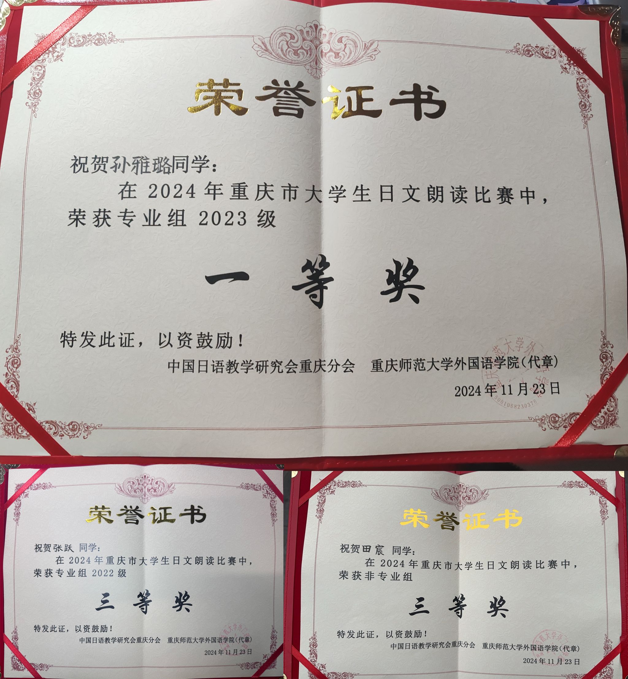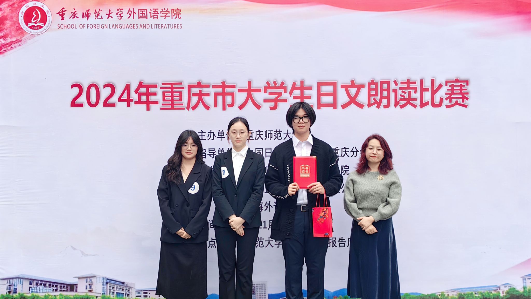 2024年11月23日,2024年重庆市大学生日文朗读比赛决赛在重庆师范大学举行。大赛由重庆师范大学主办、中国日语教学研究会重庆分会指导。比赛分为专业组2022级、专业组2023级、非专业组三个组别,共有来自11所高校的27名选手参赛。我校三位选手参赛,由日语系教师石运带队。