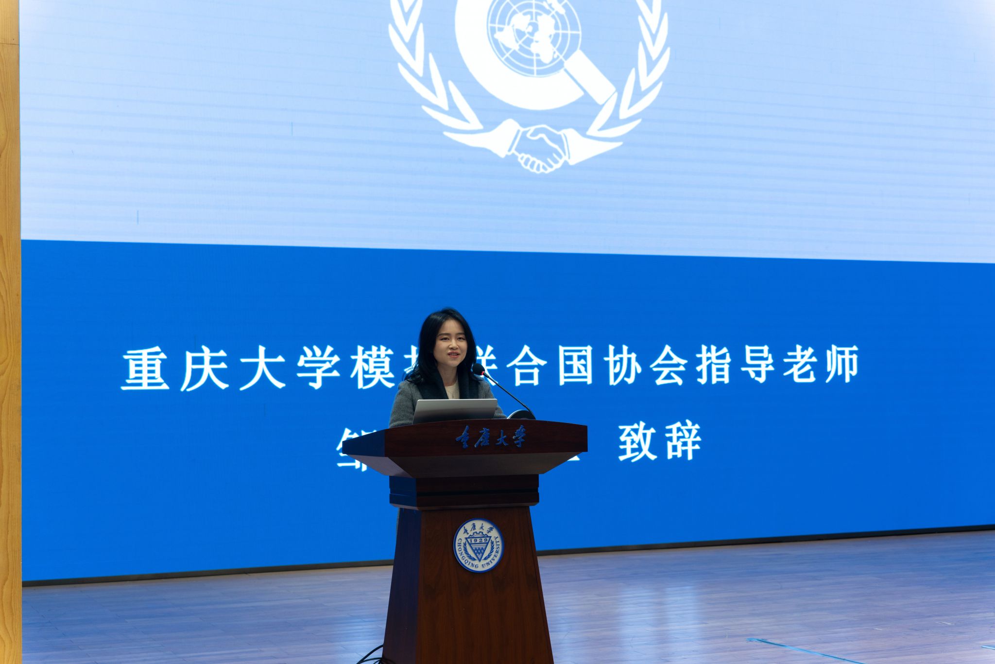 模拟联合国协会指导老师邹虹瑾女士出席并致辞。她指出,模联经历对代表们的职业发展与人生成长具有长远价值,有助于培养国际视野、批判性思维和应对全球挑战的能力。并向合作单位虎溪校区管理委员会表示衷心感谢,同时感谢同学们的积极参与。
