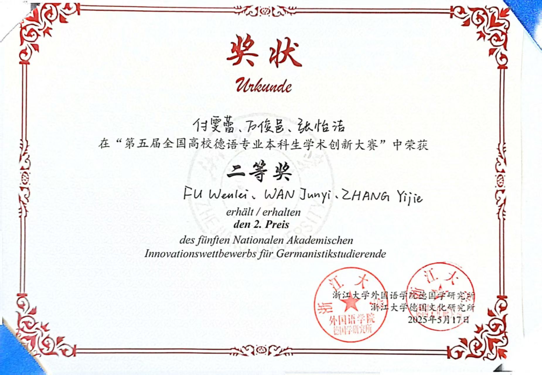 2025年5月17日,第五届全国高校德语专业本科生学术创新大赛决赛在浙江大学紫金港校区成功举办。本次大赛由浙江大学漫蛙 德国学研究所和德国文化研究所联合主办,吸引了全国多所高校的德语专业本科生参赛。我校代表队由2022级德语专业本科生付雯蕾、张怡洁和万俊邑组成。在比赛中,三位同学凭借扎实的专业知识、创新的学术思维和出色的团队协作能力,荣获全国二等奖。