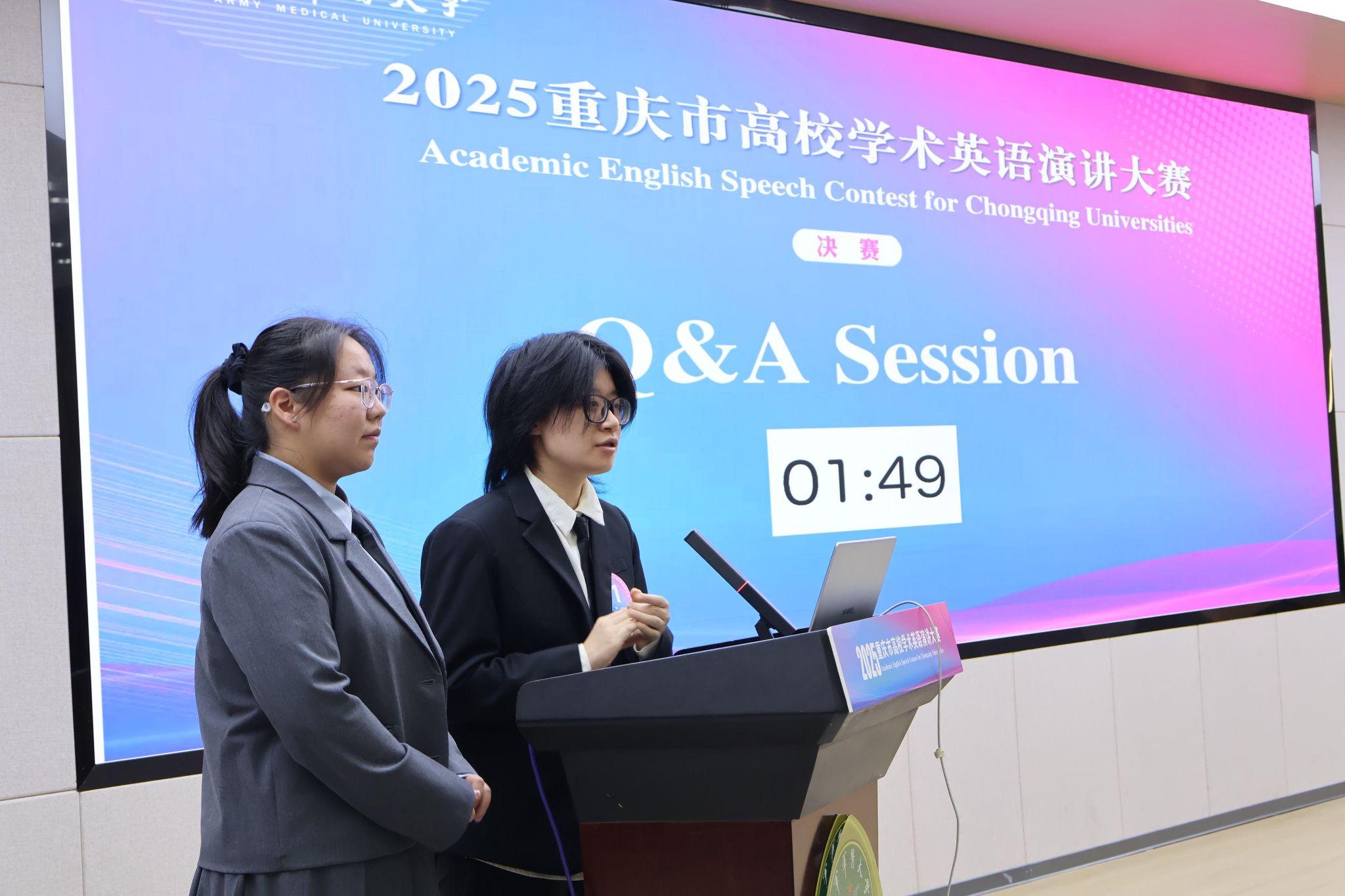 在现场问答环节,面对评委们基于演讲内容的深入追问与延伸挑战,他们迅速捕捉问题的核心,以清晰的逻辑架构组织语言,进行有效回应,尽显出色的临场应变能力与扎实的学术功底。